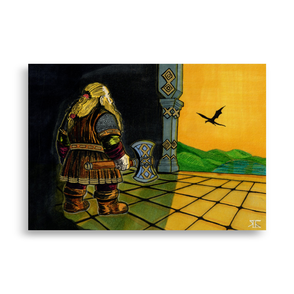 Im goldenen Licht des Morgens tritt ein Zwerg aus den Hallen seines Volkes.